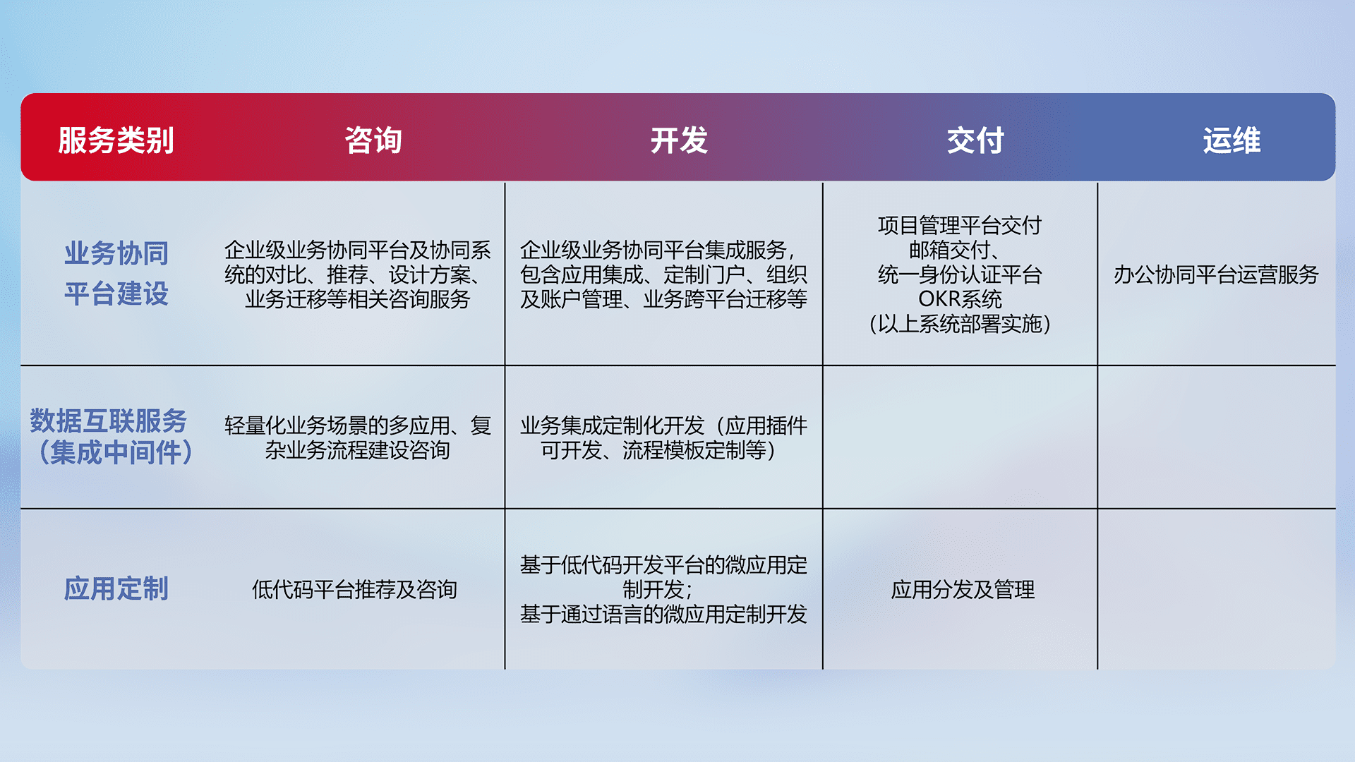 针对钉钉、、、企微、、IDaas等平台级产品提供产品的规划、、、方案、、交付、、、定制化开发等服务,,,实现如统一协同办公、、、、智能客户服务、、、、混合会议管理、、、、智能数据查询、、、等业务场景,,,,实现数字化转型。。